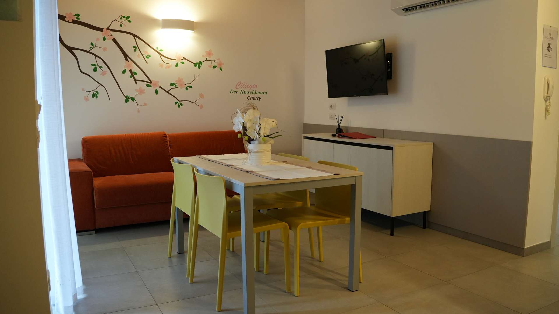 L’appartamento “il Ciliegio” è situato al piano terra e caratterizzato dagli alti soffitti con travi di legno, è accuratamente curato in stile moderno ed è composto da angolo cottura efficientemente attrezzato, ampio soggiorno luminoso con divano letto per 1 o 2 persone, TV-Sat, camera matrimoniale per 2 persone molto confortevole con ampio armadio, cassaforte, scrivania; camera da letto con 2 letti singoli per 1 o 2 persone; bagno spazioso con ampio box doccia e asciugacapelli. L’appartamento dispone di una zona relax esterna con veranda privata e coperta, tavolo con sedie, sdraio e lettino da spiaggia. Ogni appartamento dispone di un parcheggio per auto esterno gratuito.