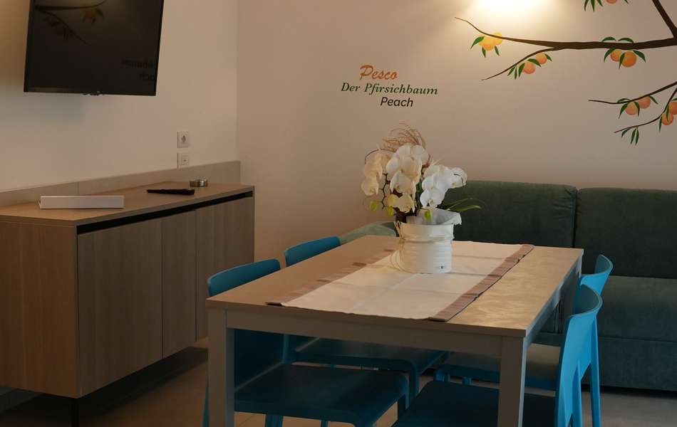 L’appartamento “il Pesco” è situato al piano terra e caratterizzato dagli alti soffitti con travi di legno, è accuratamente curato in stile moderno ed è composto da angolo cottura efficientemente attrezzato, ampio soggiorno luminoso con divano letto per 1 o 2 persone, TV-Sat, camera matrimoniale per 2 persone molto confortevole con ampio armadio, cassaforte, scrivania; camera da letto con 2 letti singoli per 1 o 2 persone; bagno spazioso con ampio box doccia e asciugacapelli. L’appartamento dispone di una zona relax esterna con veranda privata e coperta, tavolo con sedie, sdraio e lettino da spiaggia. Ogni appartamento dispone di un parcheggio per auto esterno gratuito.